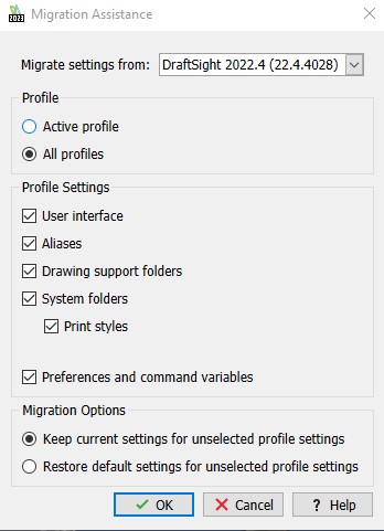 Såhär går du tillväga för att importera inställningar efter en uppdatering av DraftSight: