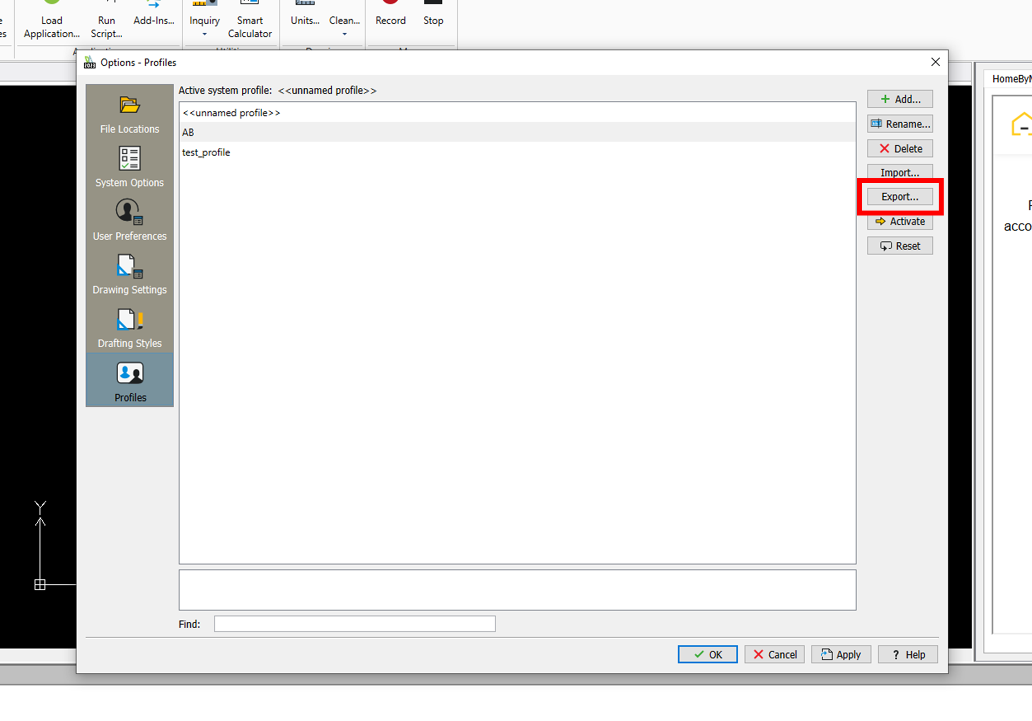 - Gå till Profiles och markera den profil vars inställningar du önskar exportera ut. Klicka på Export… Filen sparas då ut som en .xml-fil som antingen kan sparas som en backup-kopia eller flyttas över till en ny dator.