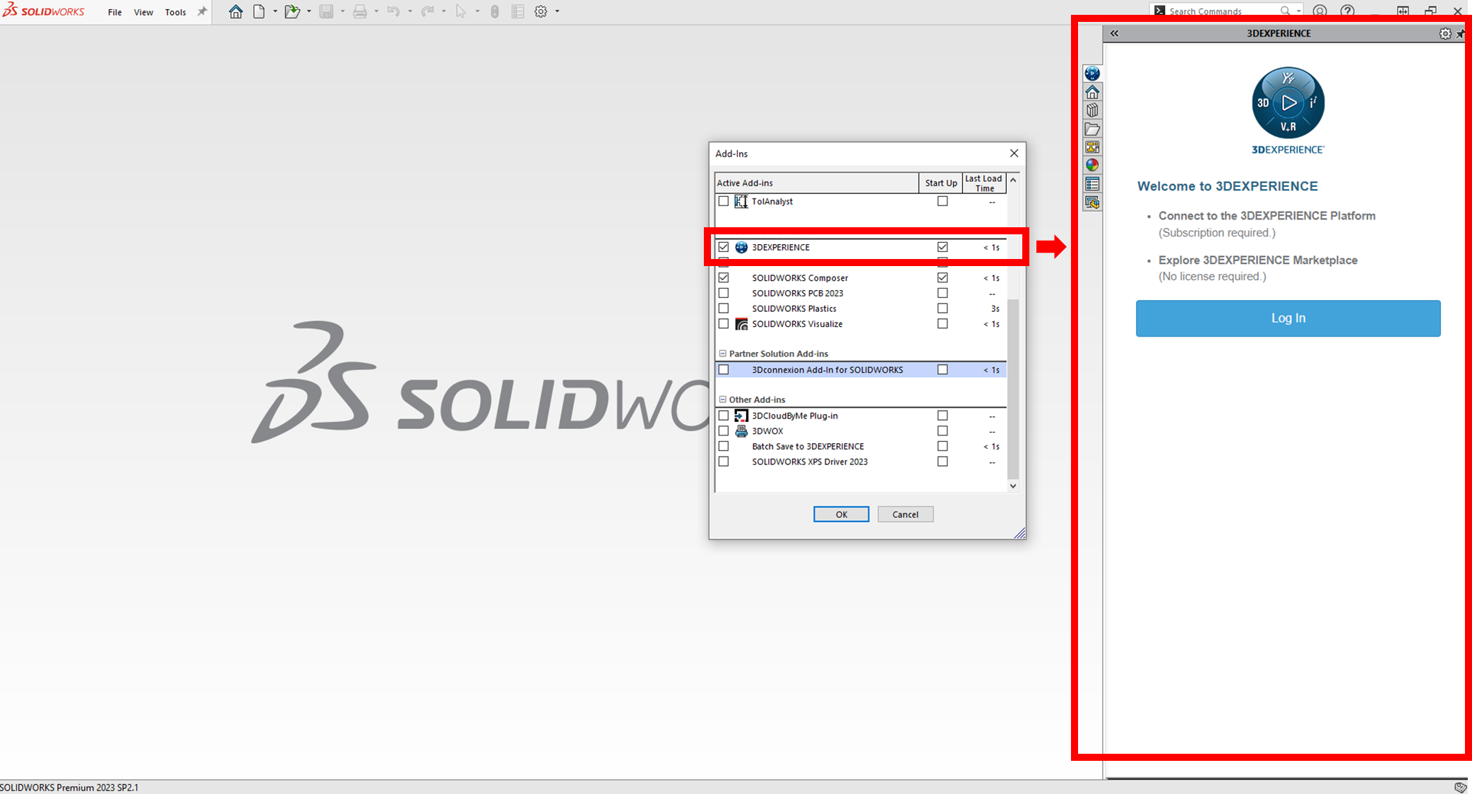 - När installationen är genomförd så kommer add-in’en att dyka upp i Task Pane i SOLIDWORKS, vid namn 3DEXPERIENCE. Logga in och kör igång!