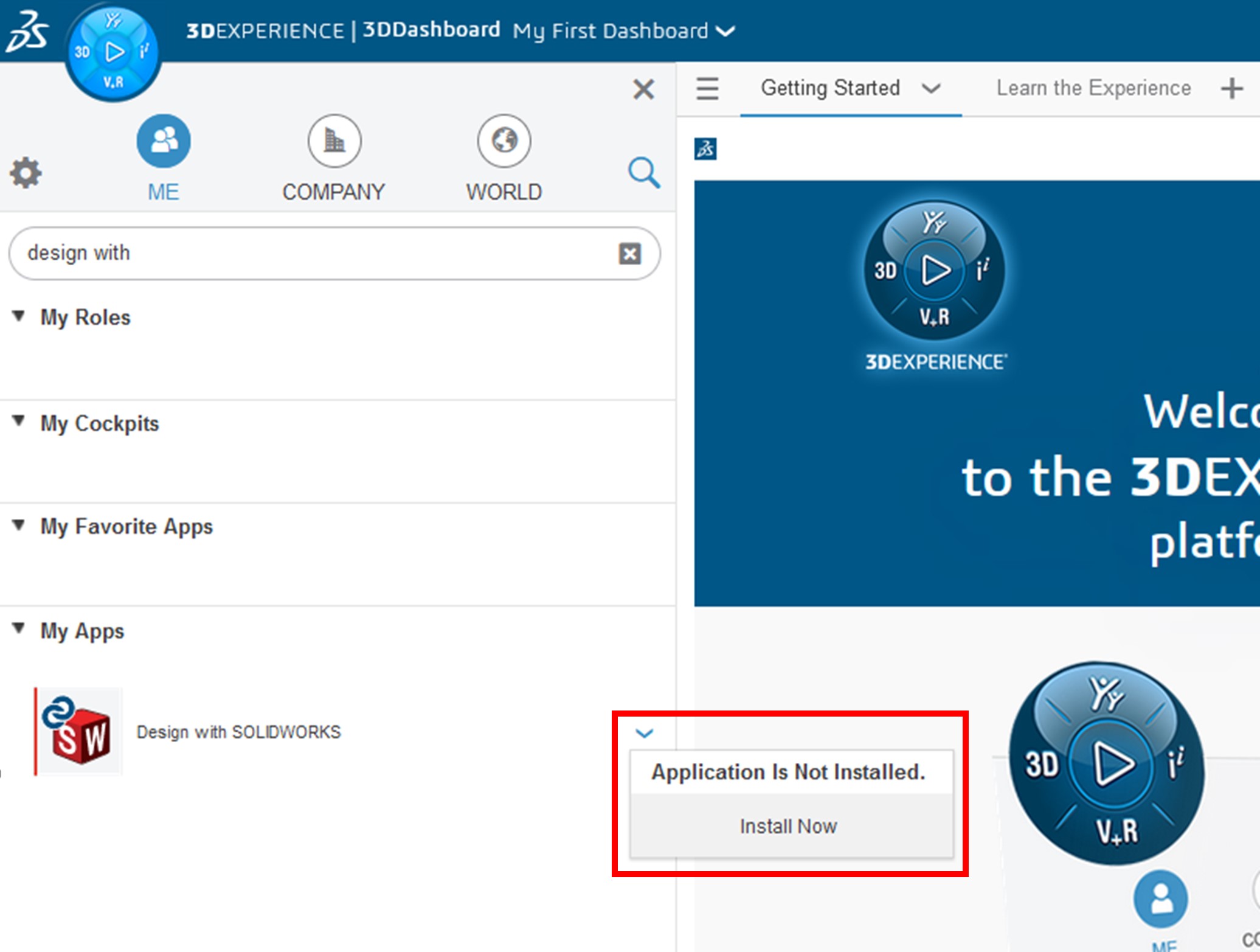 - Klicka på pilen bredvid applikationsnamnet och sedan på Install Now och sedan på Install All Roles Containing Design with SOLIDWORKS för att starta installationen.