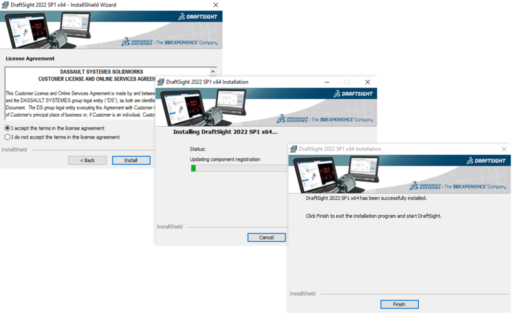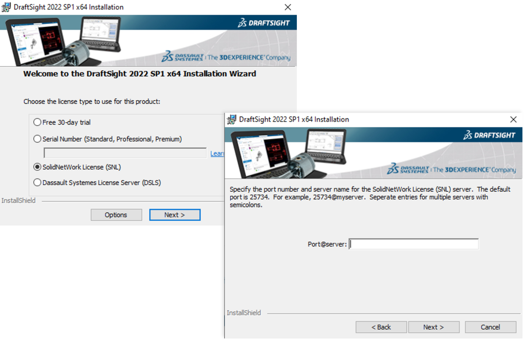 När filhämtningen är slutförd kan vi starta installationsfilen. Denna bör vi komma åt direkt från webläsarens fönster eller i mappen ”Downloads” i utforskaren (Windows). När vi kör filen packas först installationspaketet upp och därefter startas DraftSight Installation Wizard. Här får vi välja vilken typ av installation vi önskar. I detta exempel väljer vi ”SolidNetWork License (SNL)” och trycker sedan ”Next”. Vi behöver sedan tala om portnummer och servernamn så att programmet kommer åt vår flytande licens för detta exempel. Denna information är ibland redan ifylld.