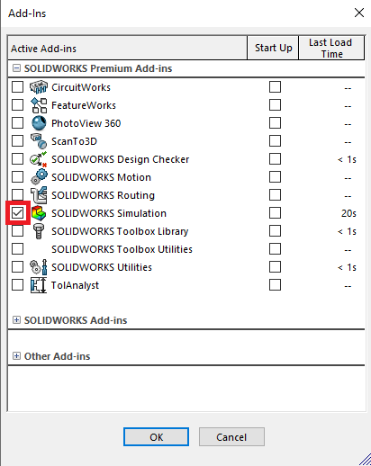 Klicka på pilen bredvid options kugghjulet i SOLIDWORKS och välj Add-ins. Bocka i SOLIDWORKS Simulation och stäng genom att klicka på OK.