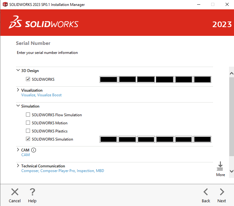 På nästa sida expanderar du rubriken Simulation och bockar i SOLIDWORKS Simulation, skriver i serienumret. Under 3D Design behöver SOLIDWORKS också bockas i, sen klicka på ”Next”.