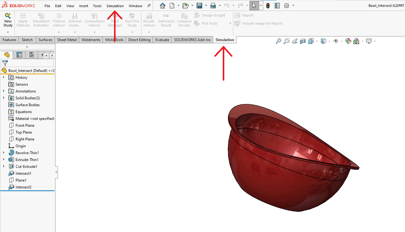 För att komma igång med simulering öppna en part eller sammanställning. Gå till fliken SOLIDWORKS Add-Ins och klicka på SOLIDWORDS Simulation. En ny flik och meny som heter Simulation ska dyka upp. Från fliken kan en ny studie startas.