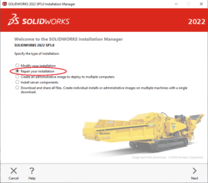 Om det inträffat något problem med vår SOLIDWORKS installation kan vi använda SOLIDWORKS inbyggda funktion för att utföra en reparation.