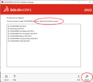 I nästa vy kan vi välja vilka av våra SOLIDWORKS produkter vi vill reparera. Alla produkter kommer vara förifyllda så vi markerar ur de vi inte vill reparera. Vi klickar sedan på Reparera (Repair) längst ner till höger.