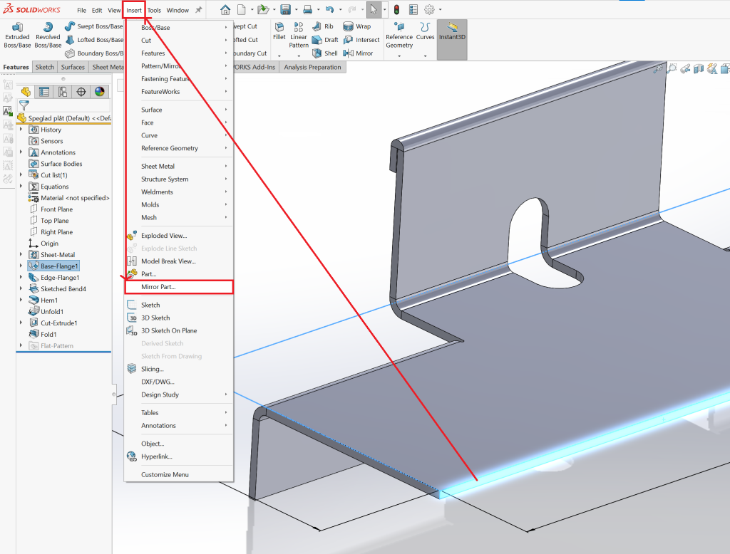 På partnivå finns inte samma alternativ i Mirror funktionen. Därmed för att till exempel skapa en Opposite Hand på en plåt är det en annan väg man behöver ta. För att skapa en Opposite Hand på en plåt markera den yta eller plan som du vill spegla mot, gå till Insert och välj Mirror Part.