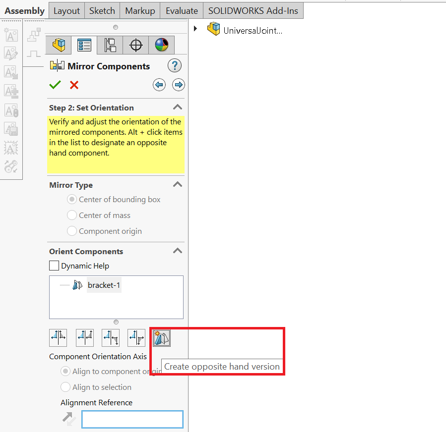 I sammanställningar finns ett alternativ i Mirror funktionen som heter Oppposite Hand. Med Oppposite Hand kommer komponenterna valda i Mirror att få en speglad partkomponent. Dessa speglade komponenter går sen att spara ut som egna dokument.