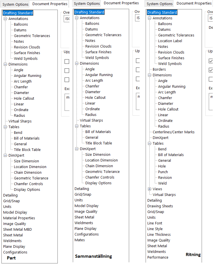 Det som finns på fliken Document Properties är det vi kan spara i en mall. Det finns mallar för part, sammanställning och ritning. Inställningar för dessa är lika förutom att det finns lite olika val vi kan påverka. Se bilden nedan.