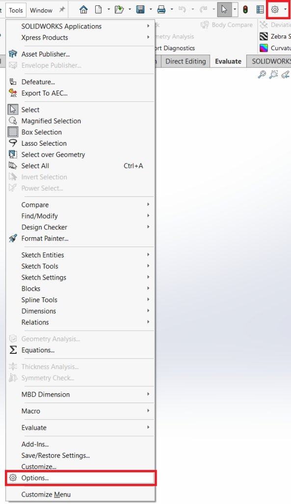 I SOLIDWORKS så finns det två flikar när man går till Tools > Options.