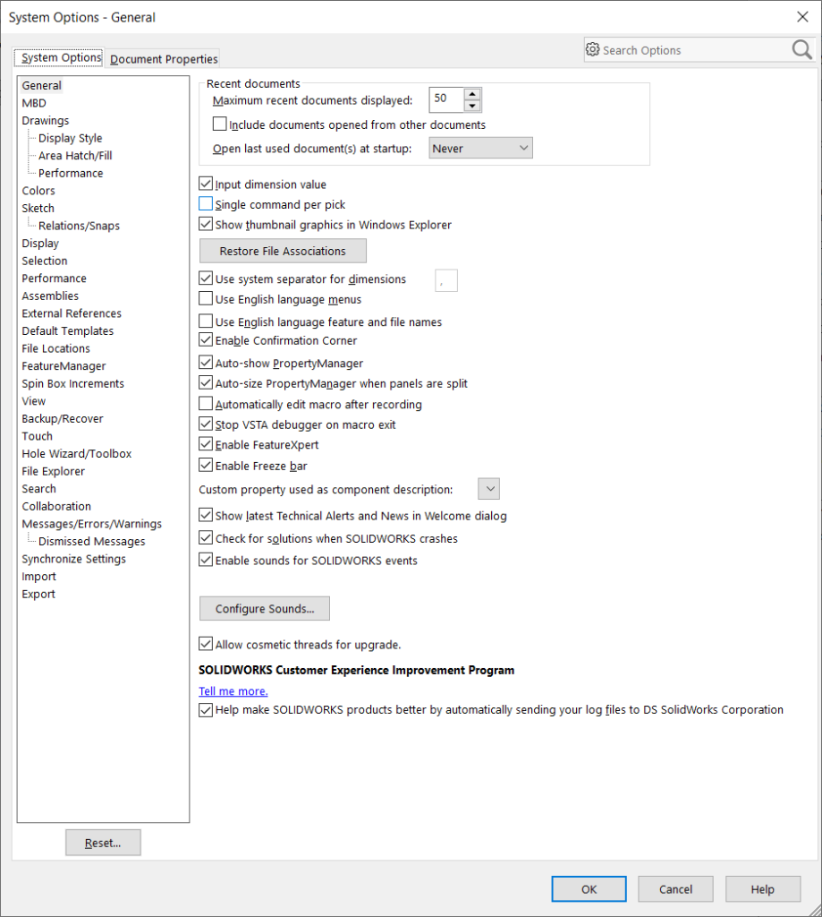 I SOLIDWORKS så finns det två flikar när man går till Tools > Options.