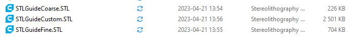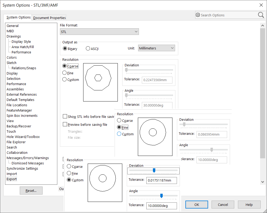 STL-filer är uppbyggda av trianglar. Beroende på vilket av Resolution valen vi gör så får vi tre olika resultat. Dessa påminner lite om dokumentinställningen Image Quality, men har inte med varandra att göra. Det som påverkas med de olika inställningarna är antalet polygoner som parten delas upp i.
