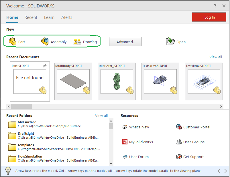 SOLIDWORKS skapar ett nytt dokument