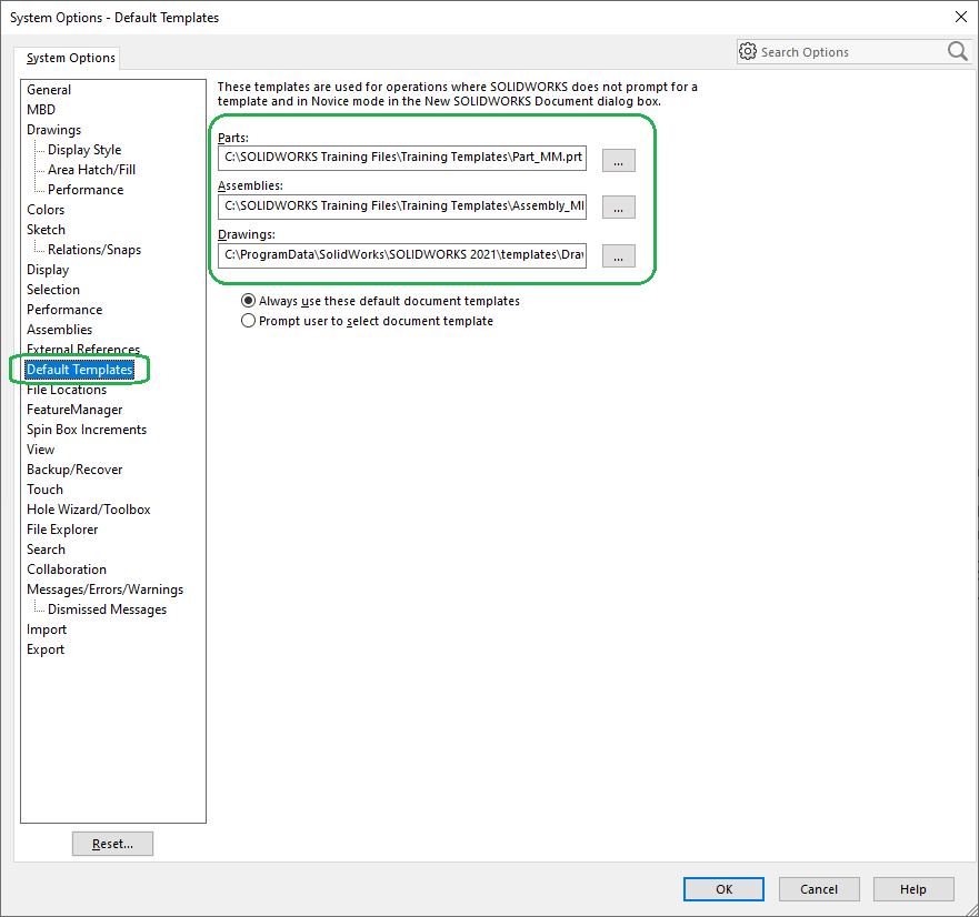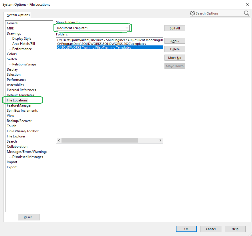 - Se till önskade mallar utpekade även under Default Templates. Särskilt i samband med uppgradering av SOLIDWORKS är det vettigt att kolla så sökvägarna inte pekar på en mapp som inte längre existerar. Det kan leda till irriterande frågor och varningar från programmet.
