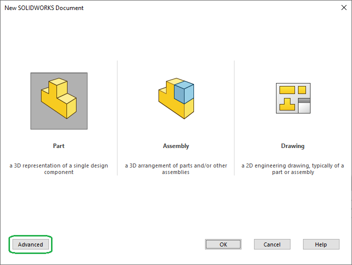 När vi skapar ett nytt dokument i SOLIDWORKS (Ctrl + N eller pappret) så möts vi av rutan New SOLIDWORKS Document. Denna ruta kan vi välja att visa på två olika sätt, Novice och Advanced. I Advanced-läget ser vi som en utforskare där vi kan välja bland de mallar som finns utpekade under System Options > File Locations > Document Templates. Om vi däremot väljer Novice-läget får vi utseendet nedan; En knapp för varje dokumenttyp. I detta läge används de mallar som pekats ut under Default Templates.