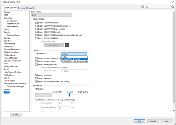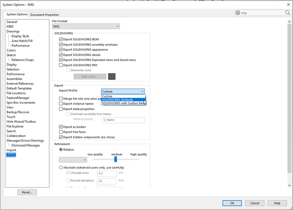 Inställningar för exportprofil i SOLIDWORKS finns under System Options> Export. I de flesta fall rekommenderas export/import- profilen SOLIDWORKS (Default). För att få med ytor in i Composerfilen används SOLIDWORKS with surface parts.