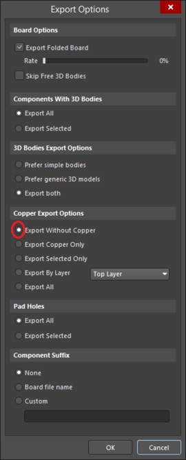 Det bästa är att den som skapar STEP-filen försöker spara den med ”Without copper”, denna inställning finns bland annat i mjukvaran Altium och tar bort alla små ytelement som utgör koppartrådarna i kretskortet.