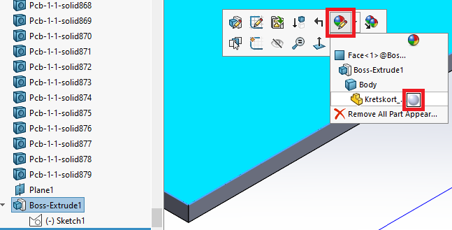 - Dölj både ”Boss-Extrude1” och orginalkretskortets platta med ”Hide”.