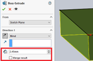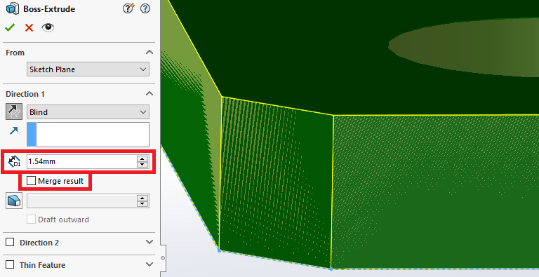- Extrudera nu Sketchen till tjockleken utan ”Merge result” med den uppmätta tjockleken på kretskortet.