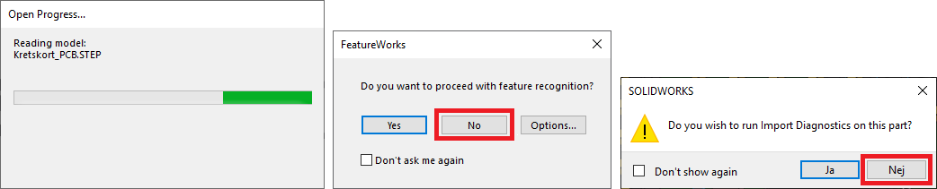 Öppna .stp-filen. (ca 1-60 minuter) Välj ”No/Nej” på både “Feature recognition” och “Import Diagnostics” (ifall de dyker upp).