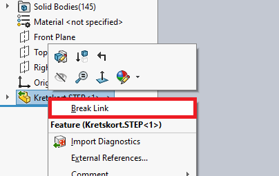 Högerklicka i featuremanager och välj ”Dissolve Components” eller ”Break Link” (ca 1-20 minuter)