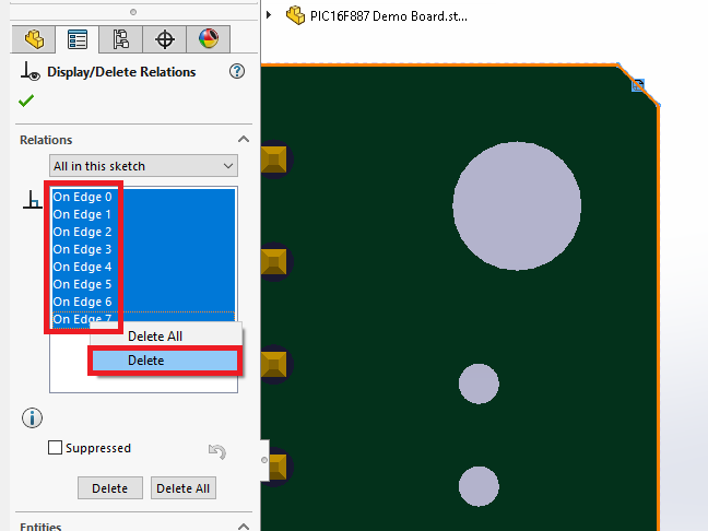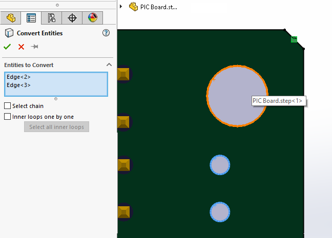 - Använd ”Convert entities” för att importera viktiga hål och kretskortets ytterkontur.