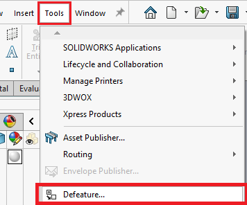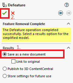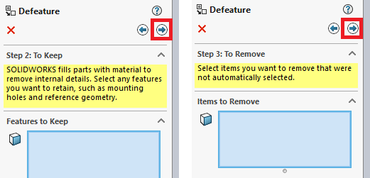 I Defeature ”Step 2”, markera innerytor i alla hål som ska vara kvar (tex för skruvar) och sedan högerpil. Tryck på högerpilen igen i ”Step 3” så att Defeature genomförs: (ca 1-10 minuter)