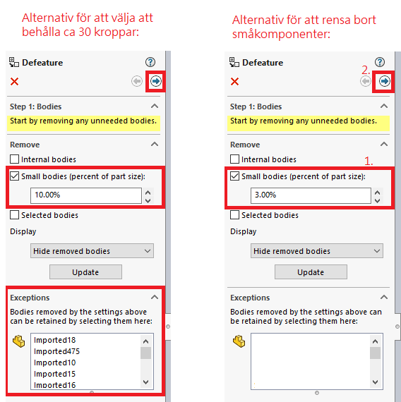 Defeature utför förenkling i 5 steg. Välj antingen att behålla högst ca 30 Bodys eller att rensa småkomponenter: (ca 1-10 minuter)