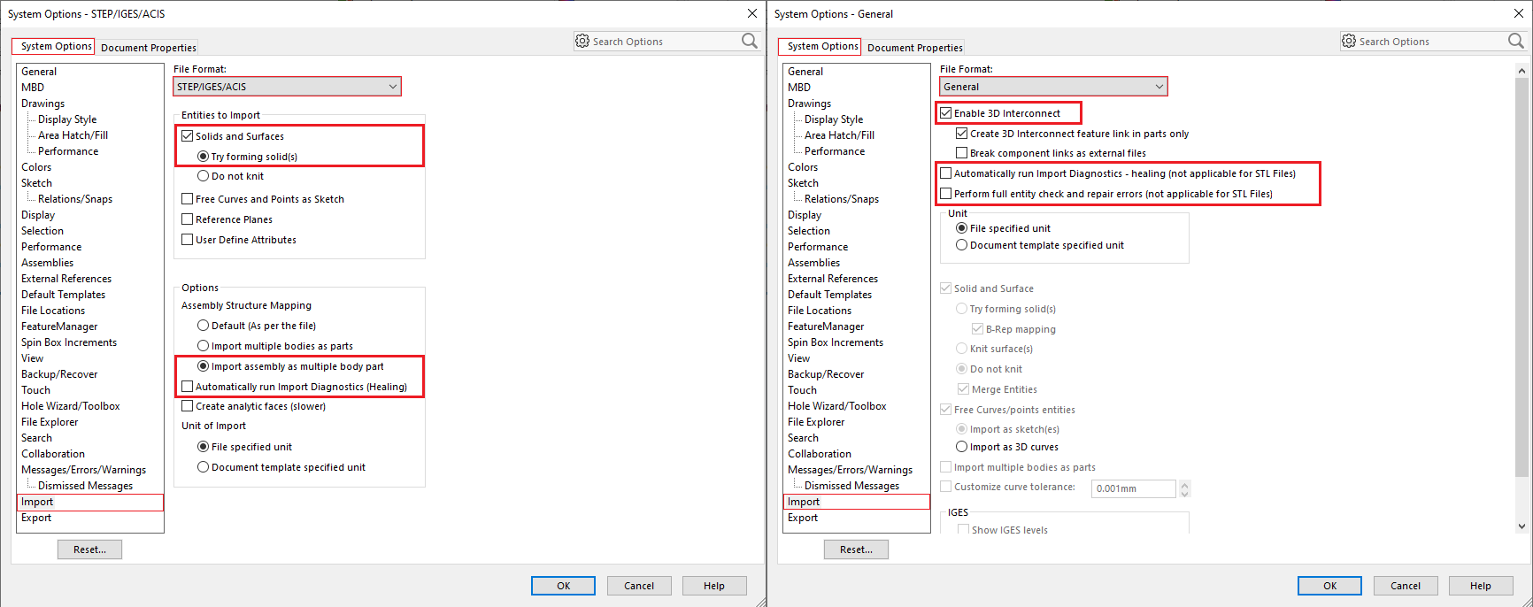 I öppningsdialogen eller i menyn för Options > Import justera alternativ för STEP och General:Aktivera ”3D Interconnect” samt bocka ur ”Import Diagnostics” och ”Entity check”.