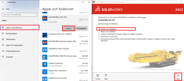 Öppna ”Windows Inställningar” och klicka på ”Appar”. Scrolla ner till SOLIDWORKS som redan är installerad på datorn och välj ”Ändra”. I det fönster som öppnas välj alternativet ”Modify your installation” och tryck på ”Next”.