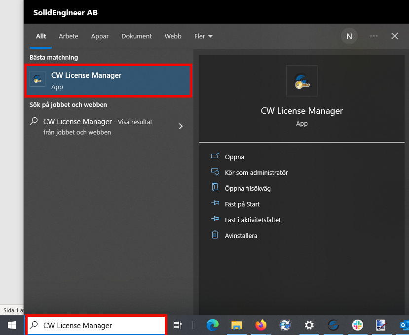 Efter ni fått en licensfil från HCL så måste denna läsas in i ditt system så CAMWorks förstår att ni har en giltig licens. Sök i Windows sökfält efter CW License Manager.