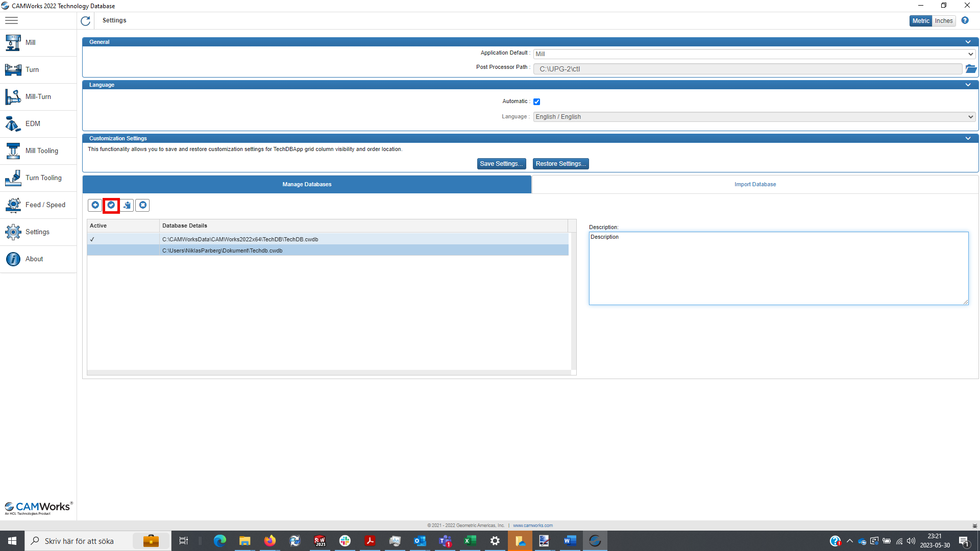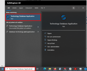 När ni har lokaliserat er databas så är det dags att ladda in den i Camworks. Se till att SOLIDWORKS/CAMWorks är avstängt. I windowsmenyn, sök på Technology database application och starta programmet.