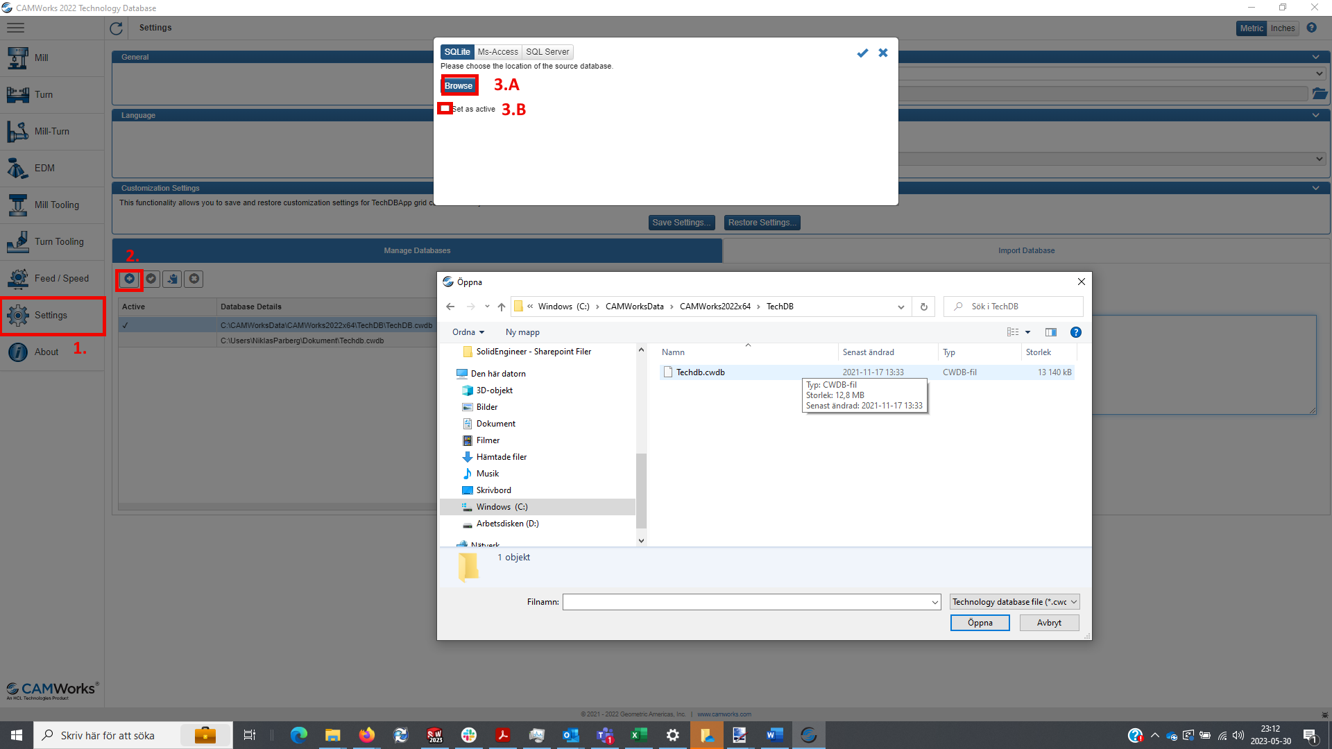 CAMWorks teknologidatabas ligger som standard i katalogen C:\CAMWorksData\CAMWorksXXXXx64\TechDB där XXXX är året för versionen, så till exempel 2020. Filen heter Techdb.cwdb.