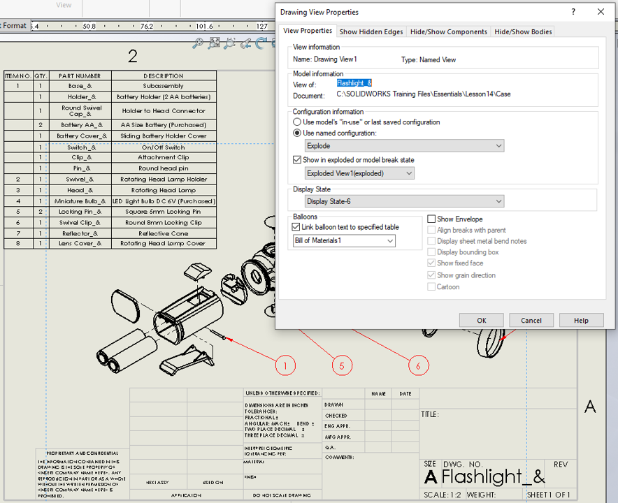 Om vi t ex gjort en förändring i vår sammanställning som orsakat att våra ballonger fått felaktig numrering. Då kan vi högerklicka på den vy där ballongen befinner sig och välja ”Properties”. Vi får då upp rutan ”Drawing View Properties” där vi finner fliken ”View Properties”. Där kan vi under ”Balloons” bocka för ”Link balloon text to specified table”. Har vi flera BOM-listor kan vi, i rullgardinslistan, även specificera till vilken BOM-lista ballongerna i vyn ska kopplas till. När vi godkänner och trycker ok bör våra ballonger nu uppdateras enligt de nummer som finns i vår BOM-tabell.