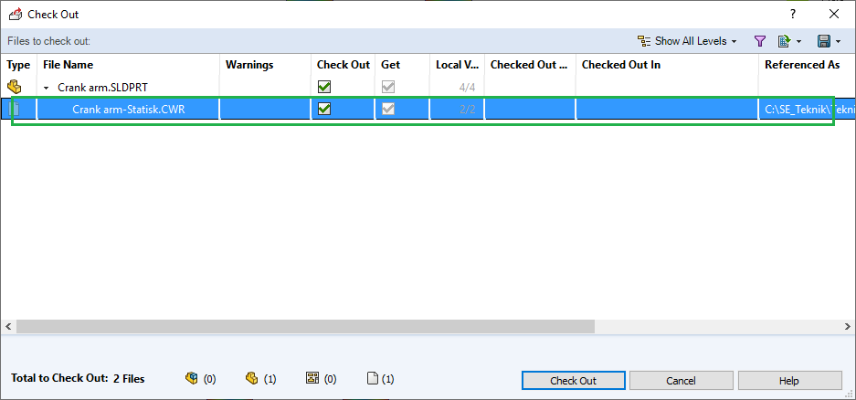 Varningarma pekar allihop mot att programmet har svårt att komma åt och ändra i resultatfilen (.cwr). Skälet till det är nästan alltid att resultatfilen är sparad och incheckad i PDM:en. När man checkar ut sin SOLIDWORKS-fil ges man möjligheten att även checka ut CWR-filen. Gör man inte det kommer CWR-filen fortsatt vara skrivskyddad och varningarna kommer som ett brev på posten.