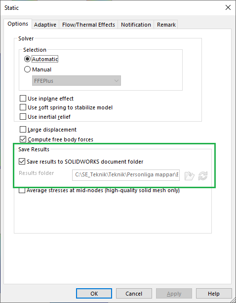 Vill man ställa in så att resultatfilerna alltid sparas utanför PDM:en kan man göra det via Simulation > Options i verktygsraden.
