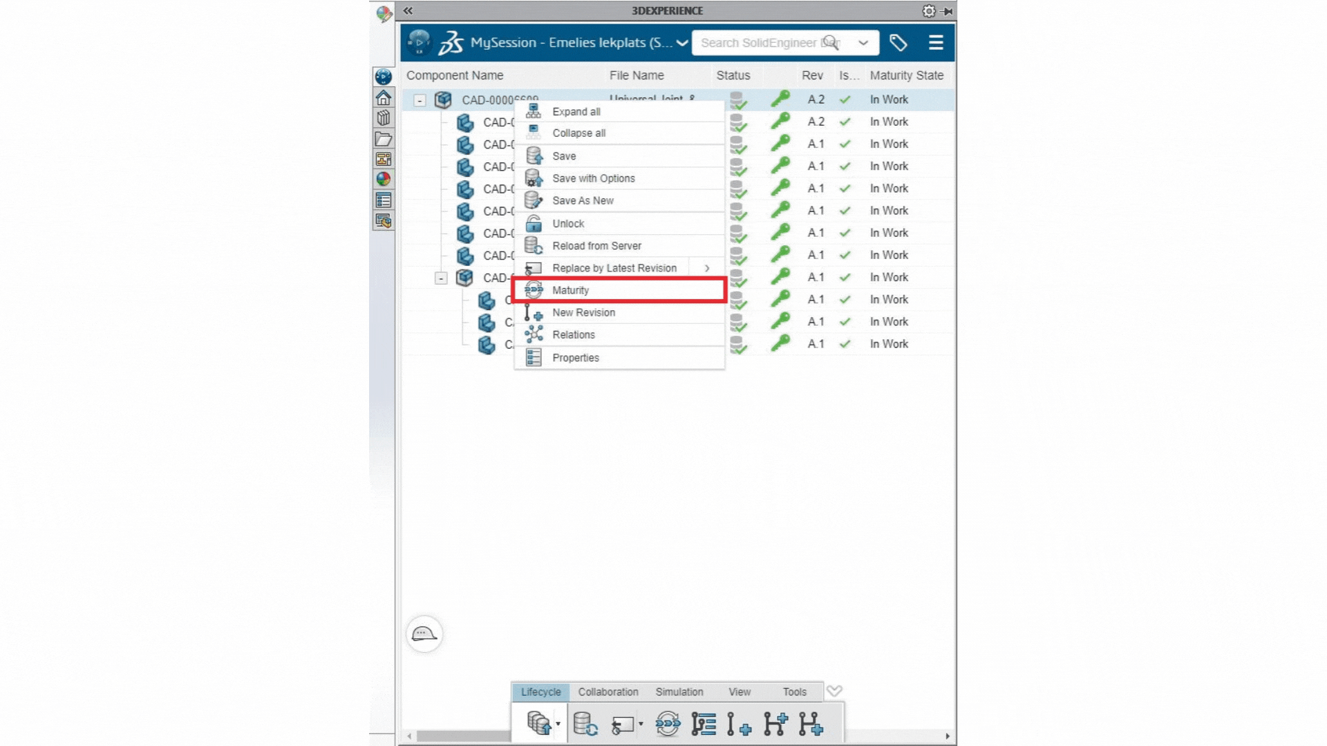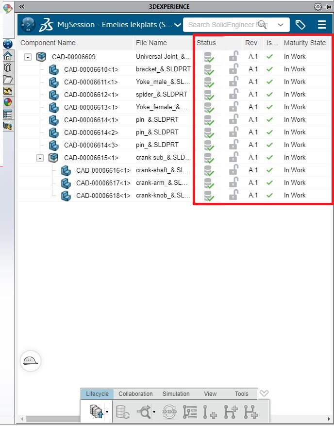 I bilden nedan visas några kolumner från 3DEXPERIENCE add-in:et som är bra att ha koll på vid revisionshantering. Statuskolumnen visar om det finns några nya ändringar som behöver sparas i molnet, i bilden nedan är filerna precis sparade i ett Collaborative Space och har därför en grön bock som betyder att de är sparade. Nästa kolumn visar om filen är låst eller inte (ut-/incheckad). Det finns en annan guide som förklarar hur detta görs. Kolumnen Rev visar vilken revision som den öppna filen har. Det går nämligen att hämta tidigare revisioner om så önskas. Om en tidigare revision öppnats, så visas detta i nästa kolumn. En grön bock betyder att den senaste revisionen visas, och ett rött kryss signalerar en äldre revision. Den sista kolumnen, Maturity State, visar vilken status filen har, bilden nedan visar att alla filer är under arbete.