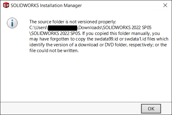 En vanlig anledning till detta är att precis som meddelandet säger så finns inte filen swdata99.id. Lösningen till detta är helt enkelt att skapa denna fil. Öppna notepad eller textredigerande program som kan spara i ett enkelt text format som en txt-fil. Skriv SOLIDWORKS 20## SP#.# beroende på vilken version och servicepack av SOLIDWORKS du vill installera. Exempelvis om du ska installera SOLIDWORKS 2022 med servicepacket 5.0 skriver du SOLIDWORKS 2022 SP5.0. Detta är vad som bör stå i filen men för att lösa felmeddelandet behövs bara rätt namn på filen, texten inuti kan alltså vara tom. Spara txt-filen som swdata99 på filplatsen som specificerats i felmeddelandet. Byt namn på filen och skriv om txt till id, om du inte ser txt tilläget gå till utforskarens visa flik och bocka i filnamnstillägg. Det ska nu gå bra att fortsätta med installationen.