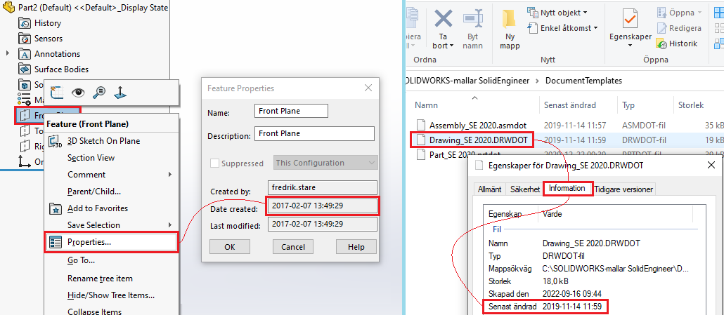 Du kan själv undersöka hur gammal mallen är. I en Part eller Assembly genom att högerklicka på ett plan (tex Front) och välja ”Properties”. Läs datumet för ”Date created” och ”Last modified”.