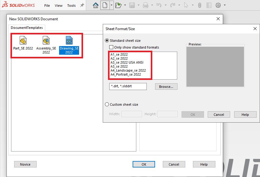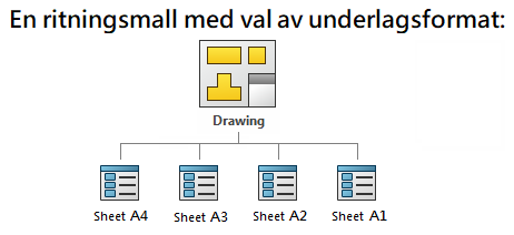 Ritningsmallar kan bestå av en ritningsmall (Drawing template, *.drwdot) och flera underlagsformat (Sheet format, *.slddrt) som alltid måste väljas, alternativt att varje underlagsformat har sparats i en egen ritningsmall så att det finns flera ritningsmallar (se bild).