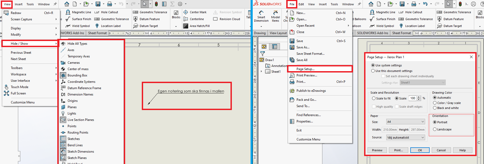 - Ta ett skärmklipp på Page Setup i mallarna för att veta att tex Portrait skall vara inställt i Drawing Sheet format för A4 Portrait-mallen.