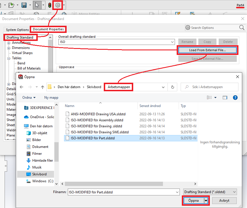 - Skapa nu respektive Part/Assembly/Drawing-dokument med en ny mall (File > New>Arbetsmappen) och öppna Options > Document Properties och välj ”Load From External File”. Öppna den sparade *.sldstd-filen för den sortens mall i Arbetsmappen.