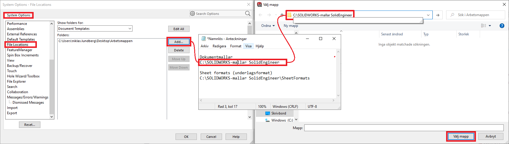 - Kopiera dina filsökvägar för ”Document Templates” och ”Sheet Formats” som inte är en filsökväg till SOLIDWORKS egna filstruktur. Klistra in sökvägarna till en textfil. Spara textfilen i Arbetsmappen.