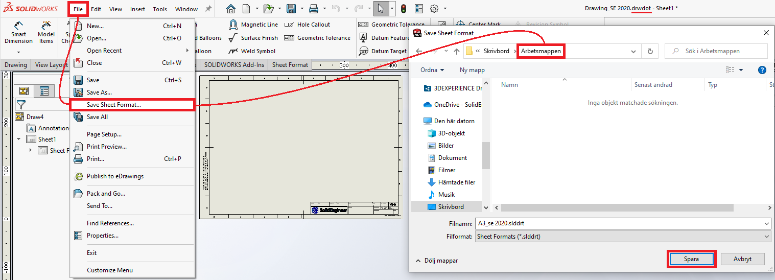 - För alla gamla Drawing templates spara också ut ”Sheet Format” till Arbetsmappen med File > ”Save Sheet Format…” med arkstorlek (tex A1, A2, A3, A4 Landscape och A4 Portrait). Ett tips är att inkludera årtal i filnamnet för enklare administration (tex ”Underlagsformat A3 2022”).