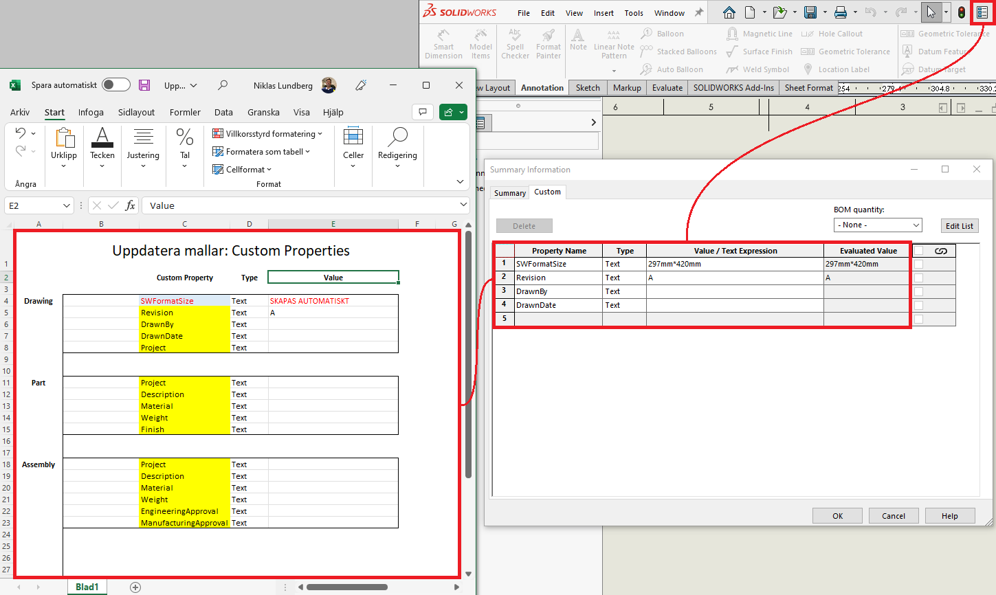 - Lägg in repektive mall och spara sedan mallen:-Custom Properties från Excel-arket