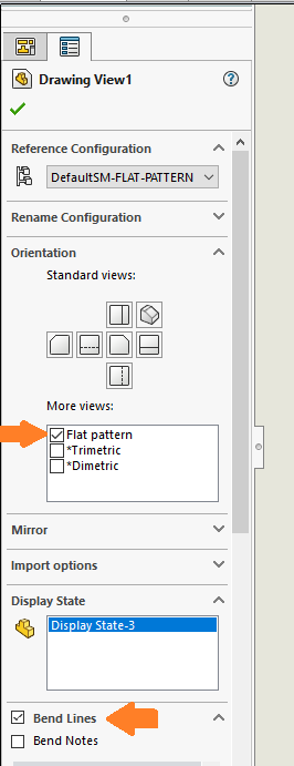 - Det kan också vara så att Flat Pattern och/eller Bend lines inte är ibockade i Property Managern för ritningsvyn. Markera då vyn och bocka i dem.
