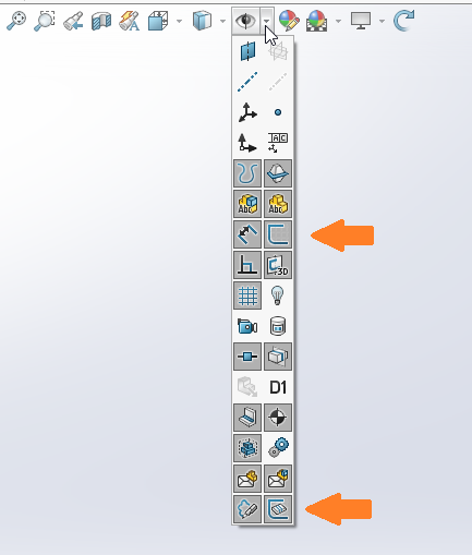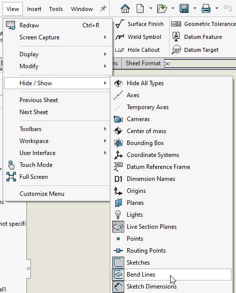- Det krävs en inställning som gör att skissen för Bend Lines är synlig. Detta ställer du in under View>Hide/Show (har du en tidigare version än SOLIDWORKS 2022 krävs istället att Sketches är synliga). Gör sedan en total rebuild (CTRL+Q).