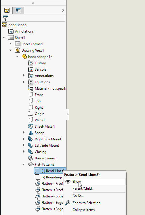 - Bend Lines ligger som en skiss i din Flat Pattern feature. Denna skiss behöver också vara synlig. Högerklicka på skissen i feature-trädet för ritningsvyn och se till så den står som Show.