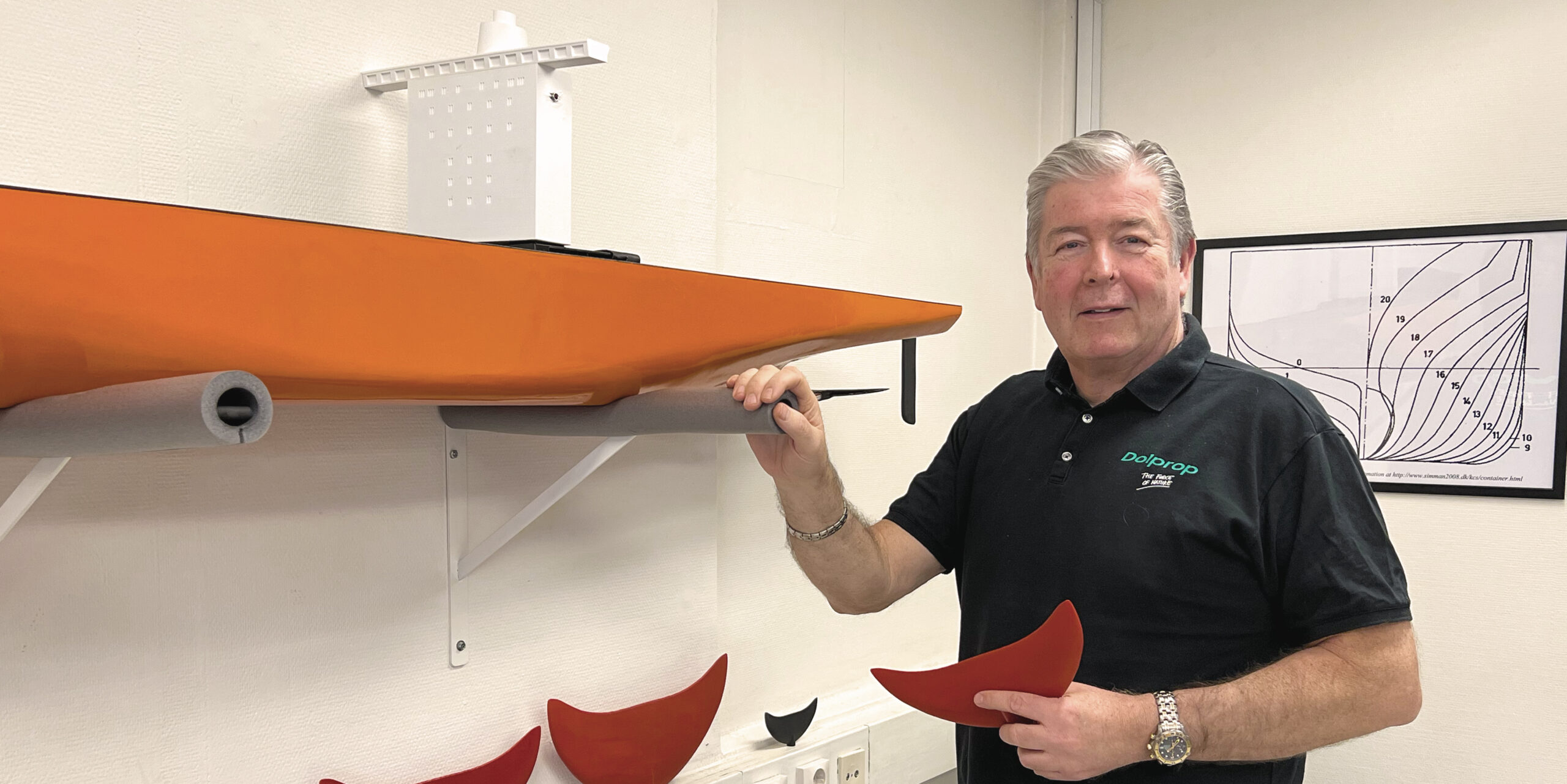 Dolprop Industries har flera aktuella projekt, på gång bla the Ship version och Jemt Converter. The Ship version är arbetsnamnet på den stora fenan för containerfartyg, men modellen heter SH1 Ship på riktigt. På bilden ser vi Thomas bredvid en skalenlig modell,1:100, av ett containerfartyg Moeri (KCS) och baktill ser vi prototypen av delfinfenan. Detta är en modell som används för forskning världen över och denna modell byggdes på verkstaden under pandemin. Modellen används för att testköra fentekniken och modellen kommer upp i skalenlig hastighet för ett containerfartyg. I verkligheten är fenan ca 14 meter bred och fenan är byggd i ett utprovat flexibelt material.