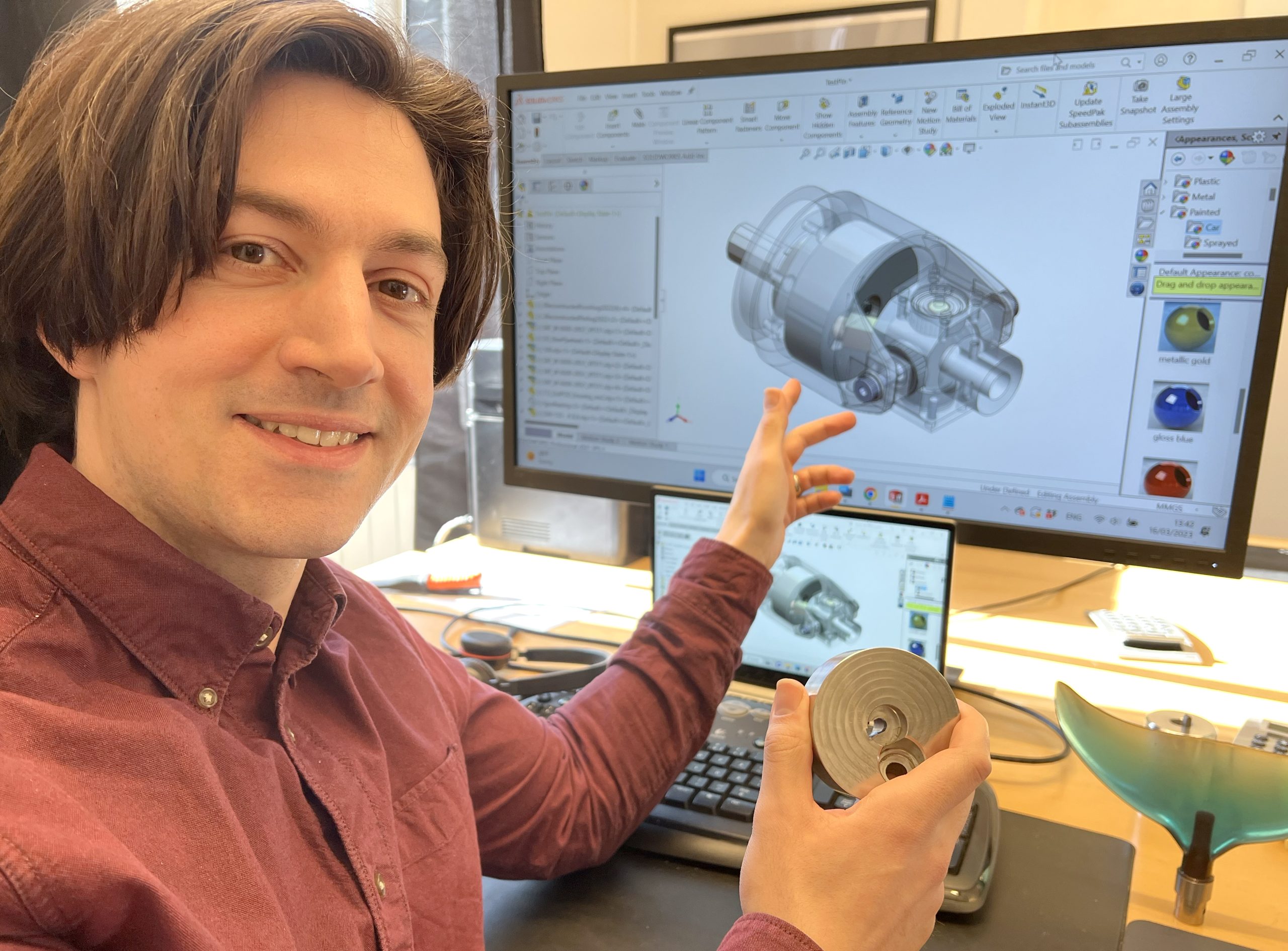 SOLIDWORKS cadprogram känner Thomas sedan 10 år men trots grundkursen och en del jobb i programmet lämnar han designarbetet till andra. –”Jag ”claddar” hellre än caddar”, säger Thomas med ett skratt. Thomas står för skissandet och Nick Lagopoulos, Head of R&D arbetar med att ta skisserna till ritbordet i SOLIDWORKS. Nick har en PhD i Biometric Propulsion.